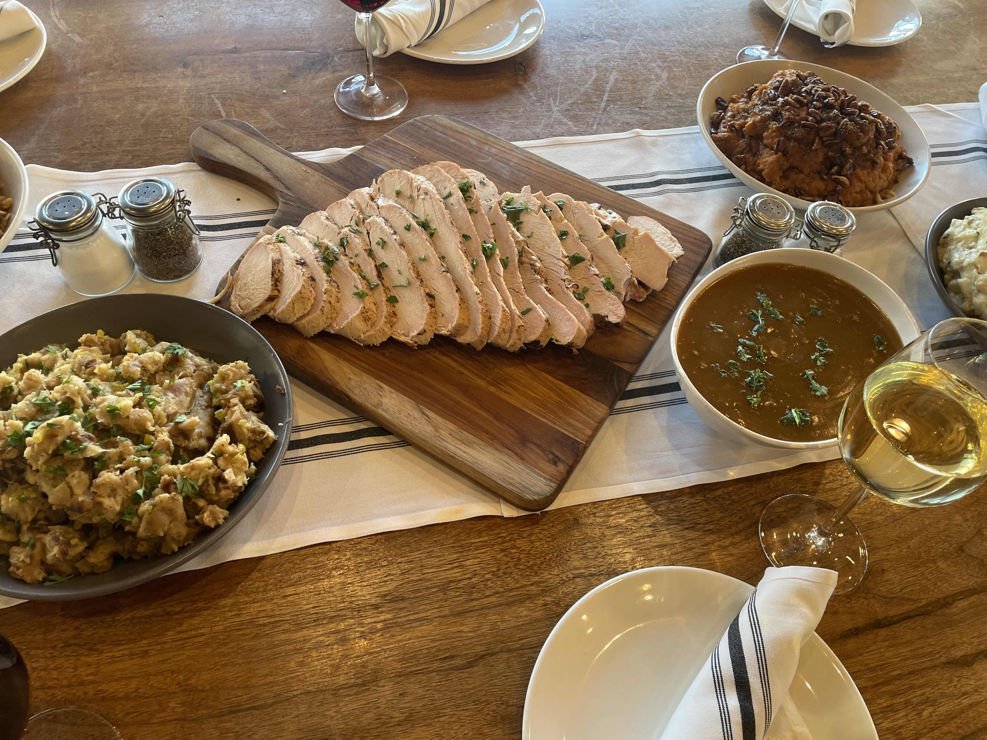 The Thanksgiving meals are $175 before tax. This meal will feed 6 to 8 people confidently. The meal consists of: Turkey Breast, Mashed Potatoes, Turkey Gravy, Stuffing/Dressing, Sweet Potatoes, Green Bean Casserole, Corn, Macaroni and Cheese, Dinner Rolls